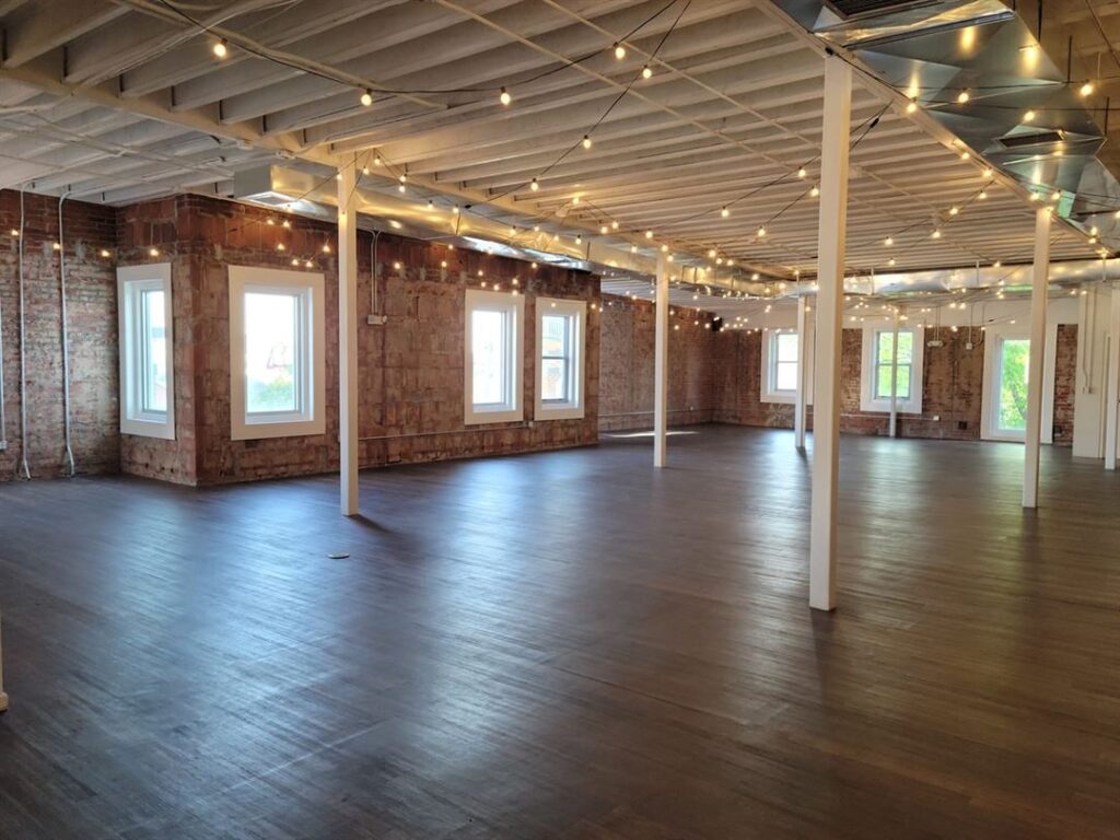 Elegant Ballroom Reception Host up to 300 guests in our second-floor ballroom, featuring high ceilings, exposed brick, cedar accents, and white-washed beams adorned with twinkling lights. The spacious dance floor and customizable layout make it perfect for dining, dancing, and celebrating.